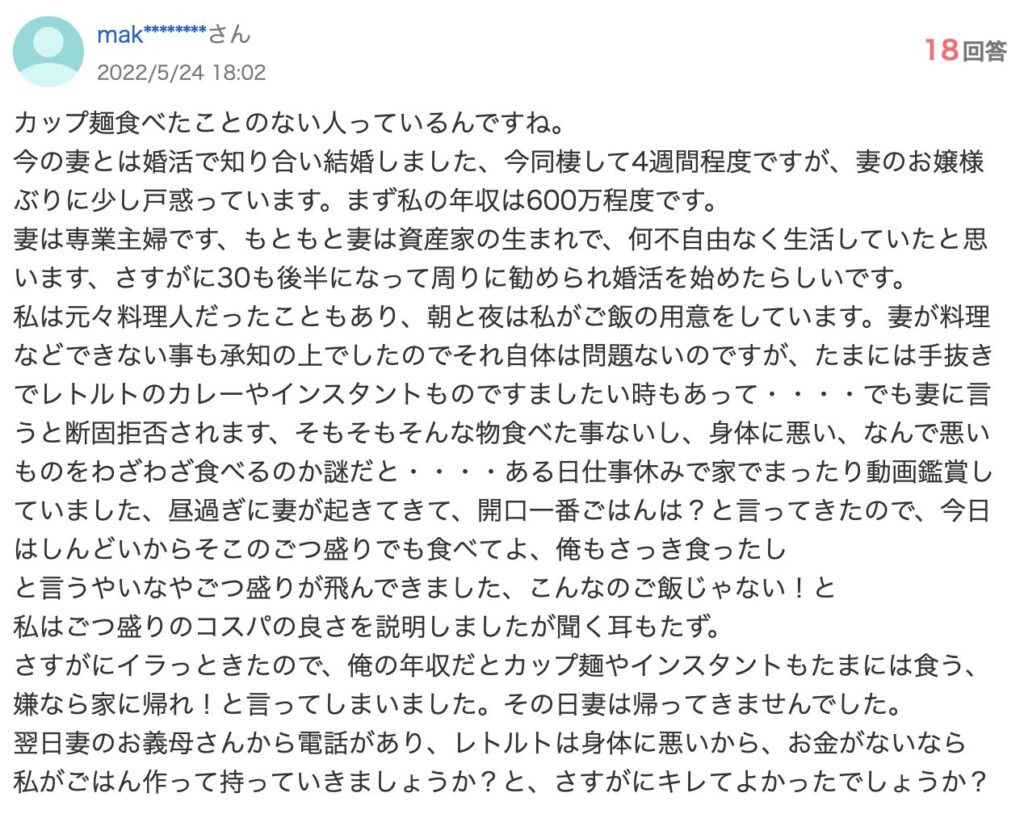 妻が料理などできない事も承知の上でしたのでそれ自体は問題ないのですが、